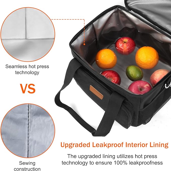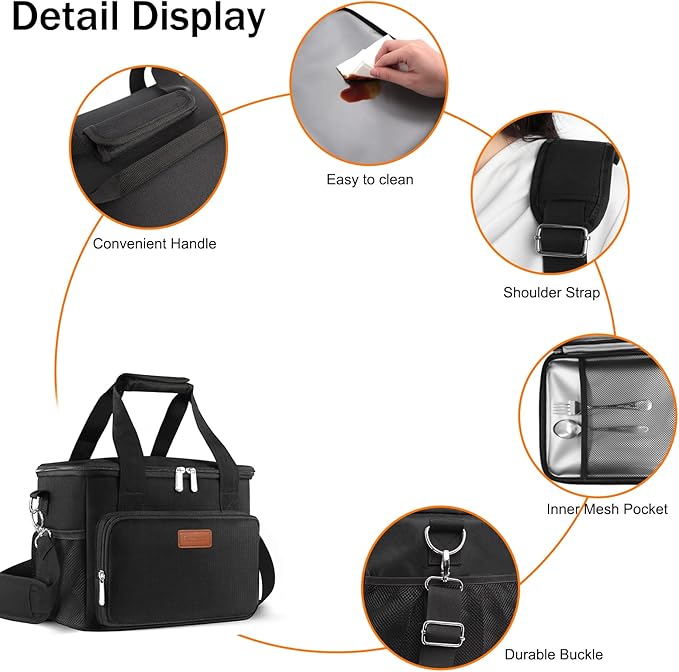 - 【INSULATED & LEAKPROOF】-- The insulated lunch bag with extra Thick Waterproof PEVA Liner, Premium 600D Eco-friendly Oxford Fabric and built-in 4mm EPE foam insulation material retain coldness or warmth, it can keep food stay cold/hot/fresh more than 6 hours. The heat-welded of thermal lunch box seams to guard against leaks and easy to wipe clean with a damp cloth.