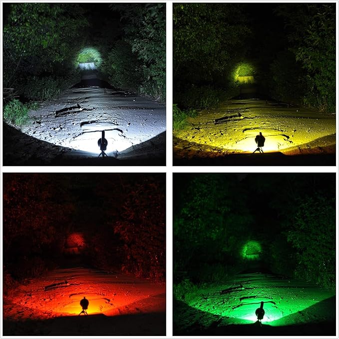 - Green Light Lens- This green light is specially designed for night hunting. Human's eyes are most sensitive to the green range of light, but animals are not spooked by a green LED flashlight, so this green light is very helpful to find the animals in the dark, like hogs, coyotes, fox, dogs, deer, turtles....are less sensitive to the green light, so you can find them without disturbing them.
