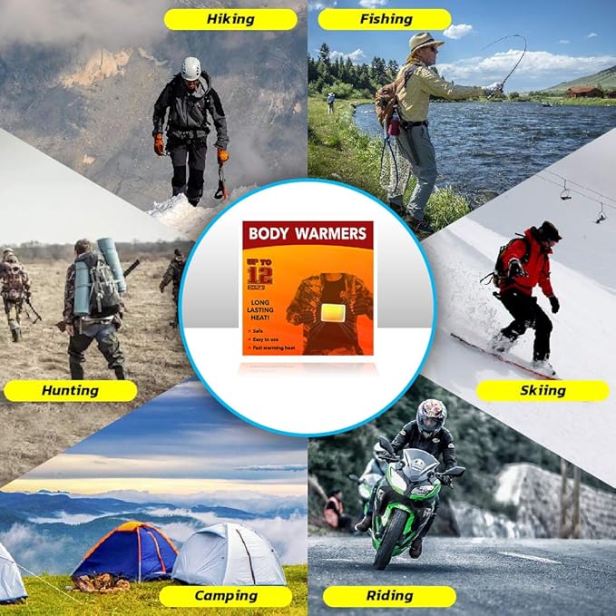 - LONG LASTING HEAT - Keep your hands,body, feet warmth when it’s cold outside with up to 12 hours of heat. Adhesive into any coats, gloves, hats, pants to feel soothing warmth instantly.