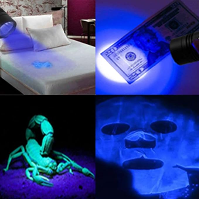 - 🔦【395NM UV Flashlight】: The led flashlight with black light, and provide Professional Grade 395 nm UV light can be used for object detection. Perfect detector for pet urine, kitchen stains, bathroom stains, stains on floor/carpets, or just on any fabric. It is a helpful tool for mineral collecting, curtain stain finding, jewelry identifying/searching, currency/card/license/passport authenticating, geocaching, automotive oil/gas leakage, and etc.