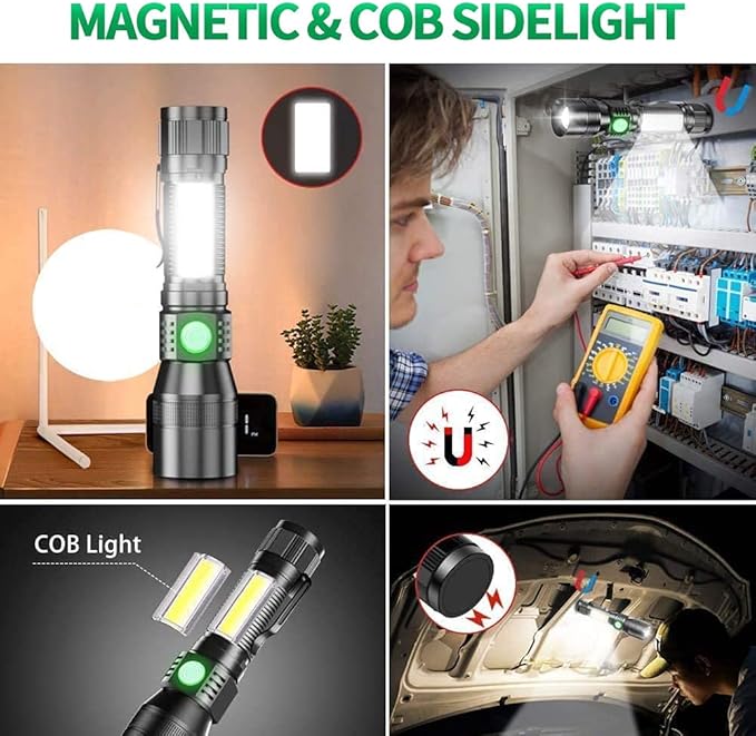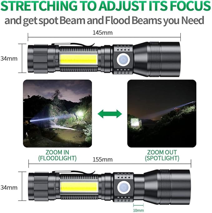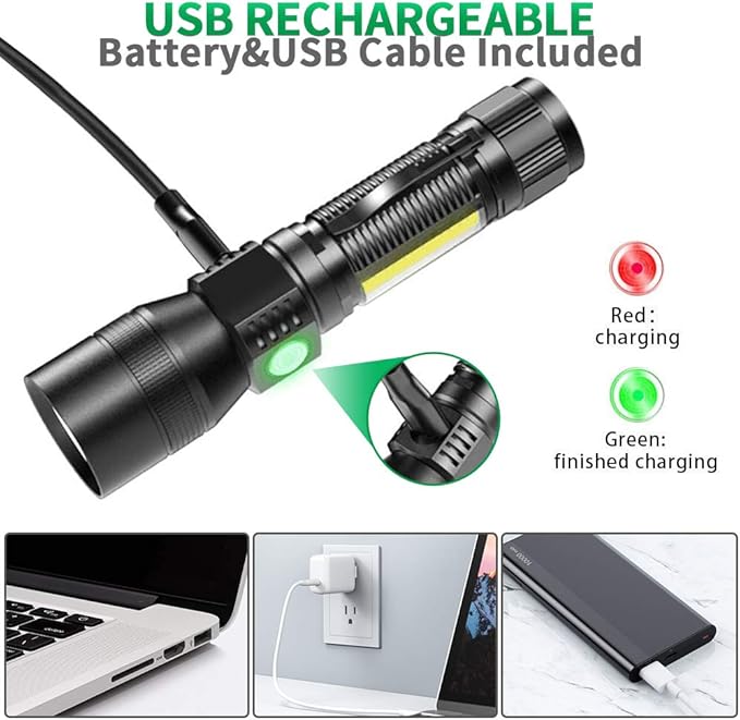 - 🔦【Flashlights Rechargeable】: This led flashlight with a rechargeable and a USB cable, Allows being safely charged from any USB port, such as a computer, power bank, car charger, etc. Fully charged can work for 8 hours. Flashlight life up to 2900 days. Dur-able and super affordable.