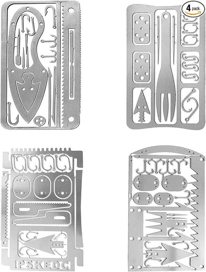 Survival Gear Credit Card Multi Tool - Camping Multipurpose EDC Multitool - Fishing Hooks, Gift Idea (Silver 4PC)