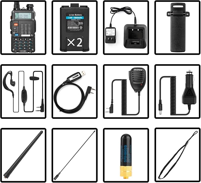 - Package includes: 1 × BaoFeng UV-5R Pro Radio, 2 × 1800mAh Li-ion Battery, 1 × Programming Cable, 3 × Antennas, 1 × Hand Microphone, 1 × Car Charger Adapter, 1 × Power Adapter, 1 × Earpiece, 1 × Belt Clip, 1 × Hand Strap, 1 × User's manual