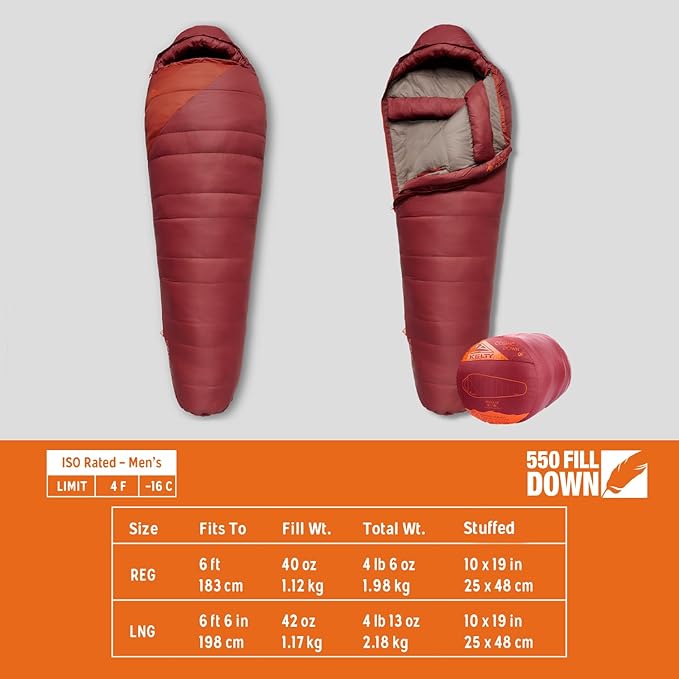 - GET DOWN: Light, compressible, warm to boot; what’s not to love about Down Fill? The Cosmic features 550 fill Kelty treated DriDown insulation, with sustainably sourced materials that are easy to pack, use, dry, and keep your buns toasty.