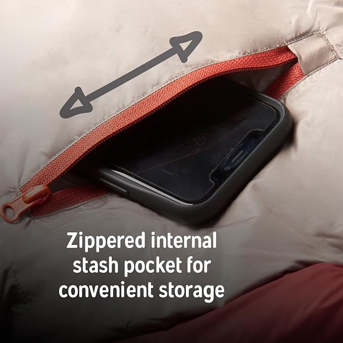 - DUAL ZIPPERS: Two sliding, locking zippers with anti-snag draft tube - unzip from the bottom to stick a foot out and self-regulate heat while enjoying mummy-bag comfort. Zippered internal stash pocket for cell phone or headlamp