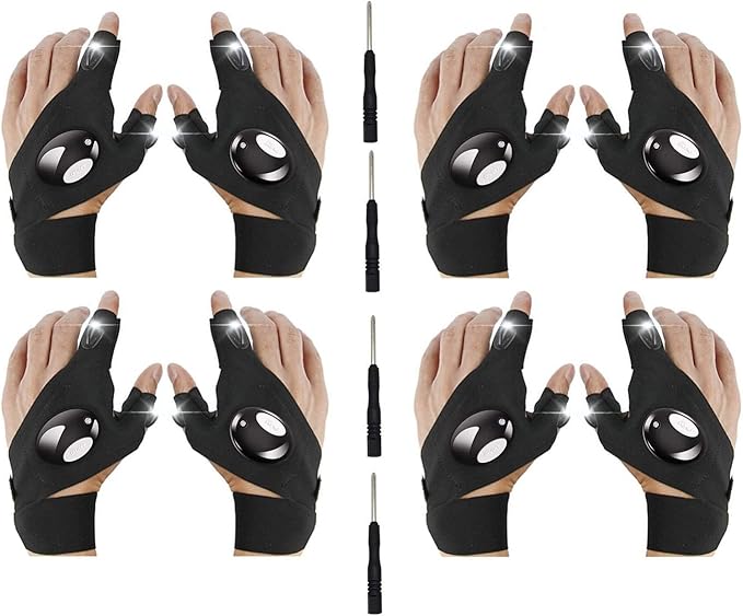- PACKAGE DETAILS --- 4 Pairs Flashlight Gloves and 4 screwdriver.The LED Flashlight Gloves for fishing, carpentry tools, construction, auto repair, sewing, woodwork and other DIY projects