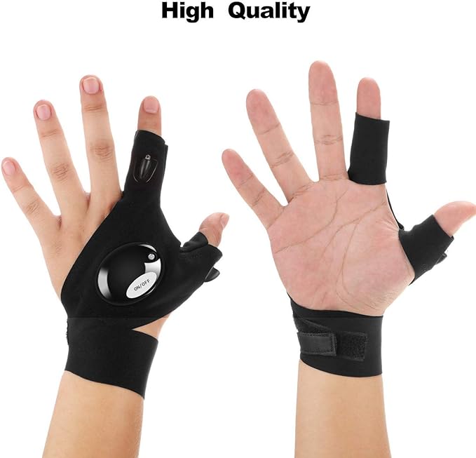 - PORTABLE --- The gloves can be directly worn on your hands, simple to use, fully release your hands and no need to holding a traditional flashlight. The adjustable Velcro can stretch to fit your hands(big or small)