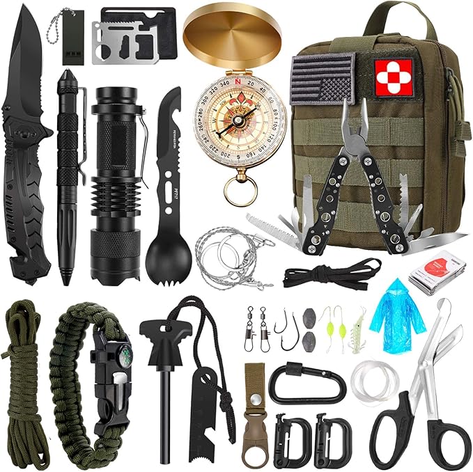 Survival Kit, 32 in 1 Professional Emergency Survival Gear Equipment Tools First Aid Supplies with Molle Pouch Gifts Ideas for Men Families SOS Tactical Hiking Hunting Disaster (Green)