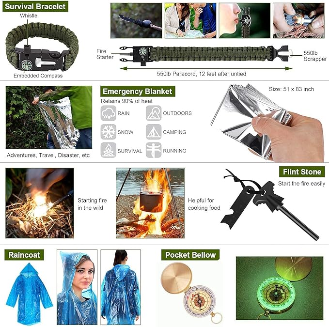 - Premium & Durable, flashlight, pen, bracelet, compass, whistle, fishing equipment set, etc.