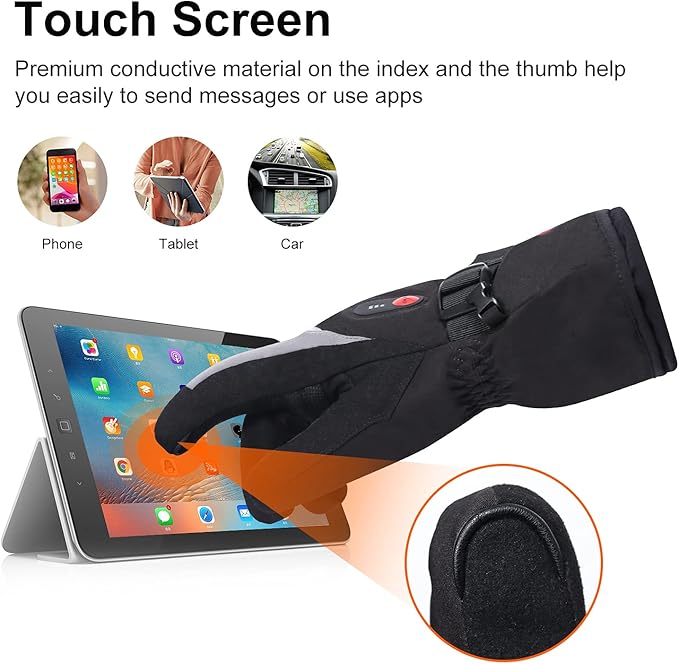 - 【Touch Screen Heating Gloves】 Sensitive touch screen material on the thumb and index finger of these menand women's heated gloves, you can freely use tablets, mobile phones, and car screens without removing the electric heated gloves; The thermal winter gloves are perfect for skiing, snowboarding, snowshoeing, snowmobiling, hunting, ice fishing, sledding, motorcycle, cycling, shoveling, working outside and anyone who has cold hands