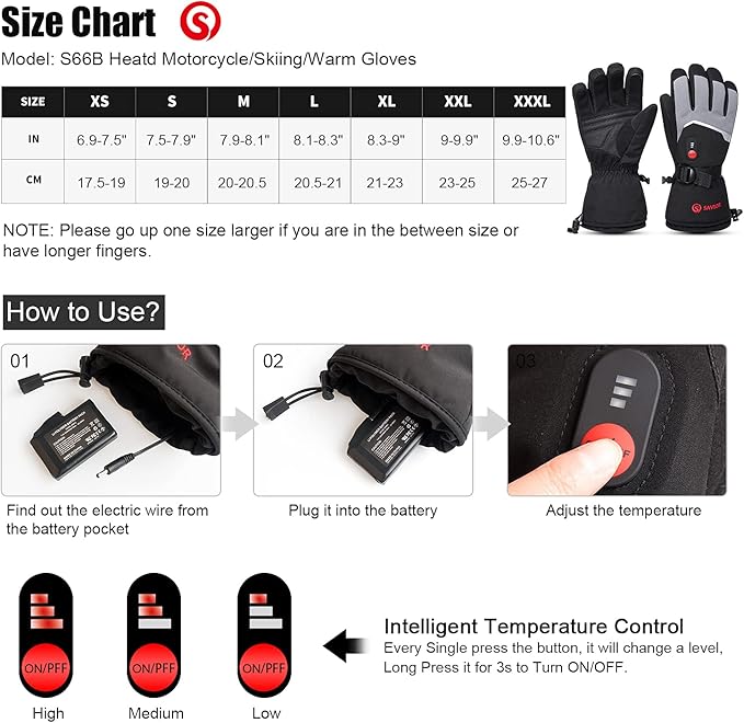 - 【Easy to Operate Heat Function】The battery-powered heated gloves are easy to operate the 3 temperature settings: High-Medium-Low; Long press the ON/OFF button for 3s to turn it On/off, and short press it to adjust the heat mode. You will feel the heat in 15 seconds, if you start with the High Setting for10-15 minutes, then turn to Medium/ Low, your hands will feel all day warm