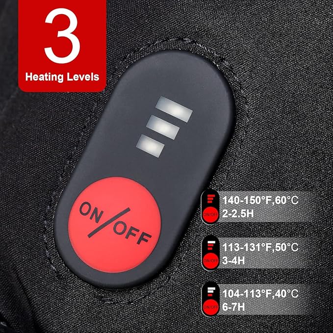 - 【3 Heated Temperature Adjustment】High Level: 60℃/140℉, about 2-2.5 hours; Medium: 50℃/122℉, about 3.5-4 hours; Low: 40℃/104℉, about 6.5-7 hours; The battery-powered heated mittens are easy to operate, Short Press the ON/OFF button to turn on/ off /adjust thermal control. 2pcs CE& UL Certified Savior 7.4V 2200mah rechargeable Li-polymer batteries, the heated hand warmers are safe and comfortable to use