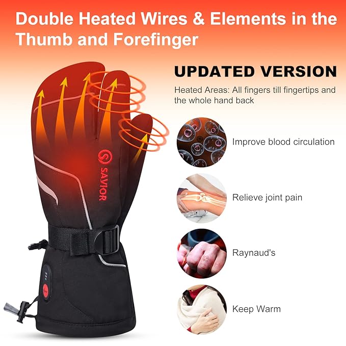 - 【Double Heated Wires & Elements in the Thumb & Index Finger 】Savior 2021 Heated mittens increased 20% heated elements in the Thumb and covering the whole hand back, fingers to fingertips, you will feel much more balance warm and heat wearing these lightweight heated ski mittens