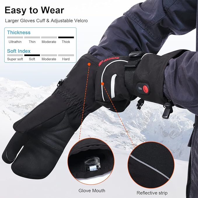 - 【Flexible 3-Fingered Gloves & Touchscreen】 3-fingered heated gloves help you flexible gripping items well, 2021's latest sensitive touch screen material on the men’s heated gloves’ thumb, you can freely use tablets, mobile phones without removing the heated ski mittens; The thermal winter gloves are perfect for skiing, snowboardin, snowmobiling, hunting, ice fishing, motorcycle, cycling, shoveling, working outside and anyone who suffers Raynaud's, bad circulation, arthritis and stiff joints.