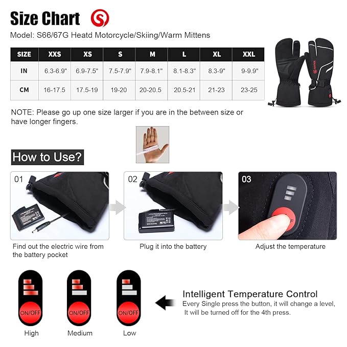 - 【3 Heated Temperature Adjustment】High Level: 60℃/140℉, about 2-2.5 hours; Medium: 50℃/122℉, about 3.5-4 hours; Low: 40℃/104℉, about 6.5-7 hours; The battery-powered heated mittens are easy to operate, Short Press the ON/OFF button to turn on/ off /adjust thermal control. 2pcs CE& UL Certified Savior 7.4V 2200mah rechargeable Li-polymer batteries, the heated hand warmers are safe and comfortable to use