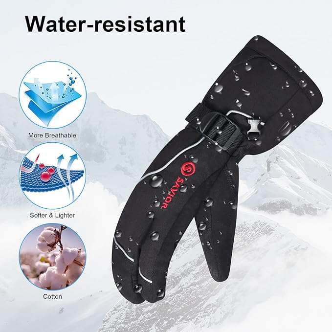 - 【Water-resistant, Breathable, and Anti-slip】winter snow gloves are made of insulated, fleece, water repellent (DWR), windproof material, they are no bulky, but breathable, lightweight to keep your hands dry and comfortable. Anti-slip silicone gripping surface, adjustable Velcro on the wrist ensure a snug fit