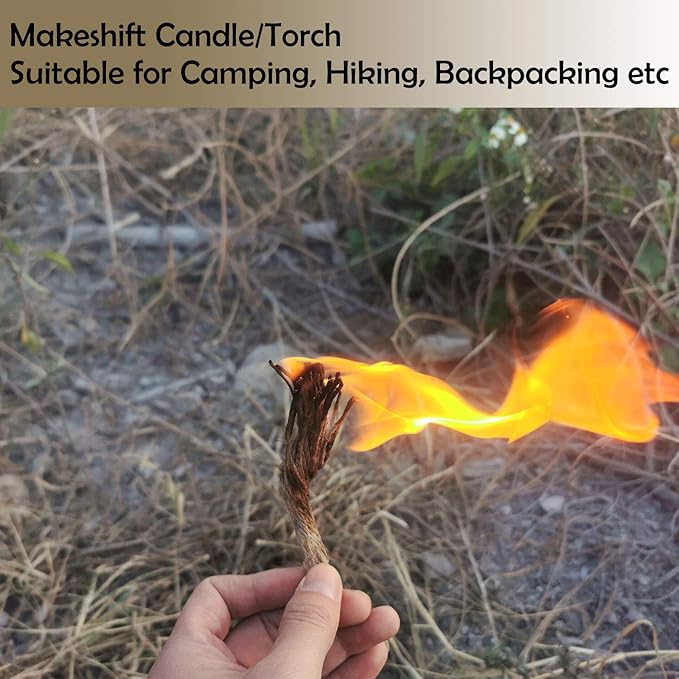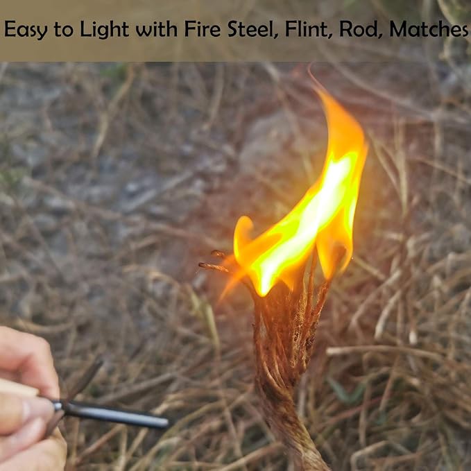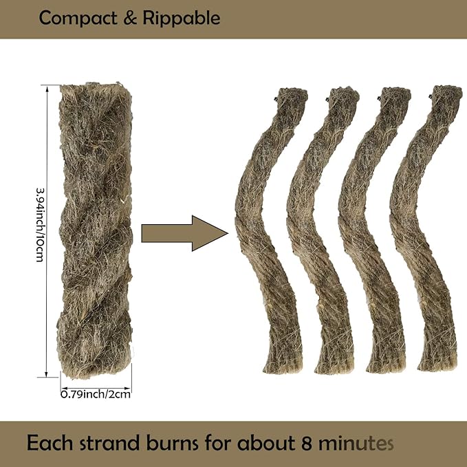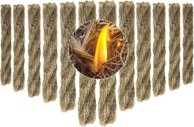 - The package contains 12 pieces fat rope, each rope overall length is 3.94”, width of 0.79”, weighs 0.79oz. The whole tinder stick can burn for 32 minutes. Must have quick fire starter tool