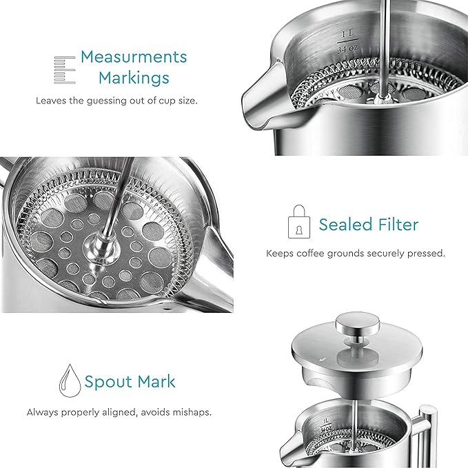 - ONLY THE FINEST MATERIALS - This stainless steel french coffee press is made with 304-grade stainless steel that is sturdy, classy, modern & BPA Free. This coffee press is vacuum layered with double-wall construction that retains your coffee hot for longer.