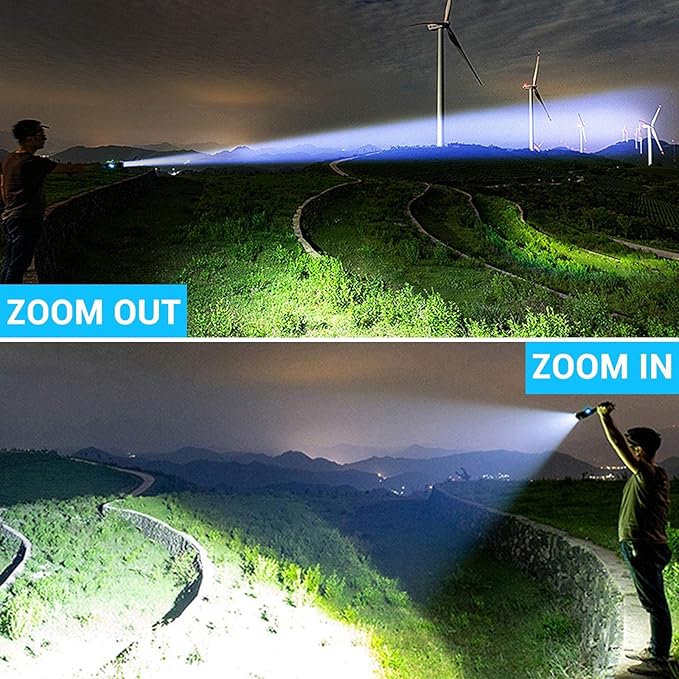 - ZOOMABLE TORCH: It support telescopic zoom. Zoomed in as a spotlight to light for long range observation. Zoomed out as floodlight to light for wider area. Designed to meet your different lighting needs. Come with one wrist strap which is convenient to carry.