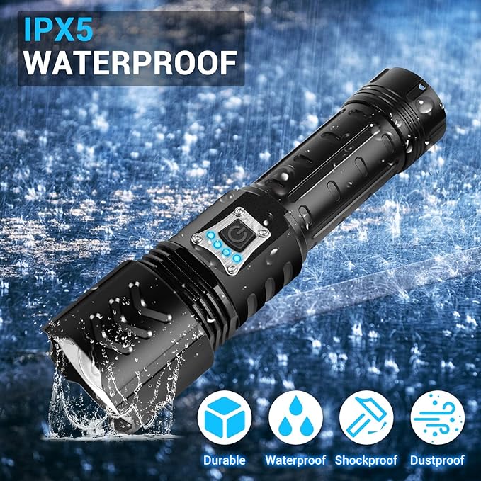 - TACTICAL FLASHLIGHT WITH WATERPROOF OF IPX6: Adopting high performance waterproof of IPX5, allowing for using it in the rainy day. Made of aluminum alloy means it is enough shock-resistant to endure rough handlings.