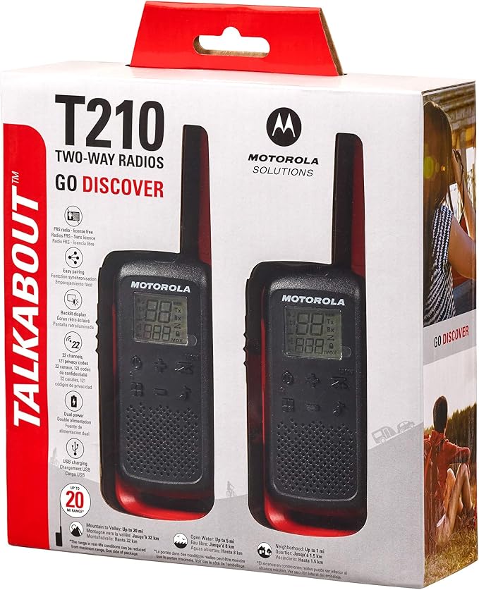 Motorola Solutions, Portable FRS, T210, Talkabout, Two-Way Radios, Rechargeable, 22 Channel, 20 Mile, Black W/Red, 2 Pack