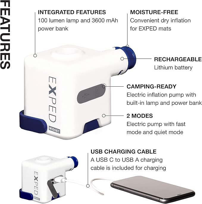 - Easy Self-Inflation - Widget is a high-power sleeping mat pump with a battery/motor/fan strong enough to rapidly inflate multiple high-volume EXPED mats, eliminating humid, lung-powered inflation