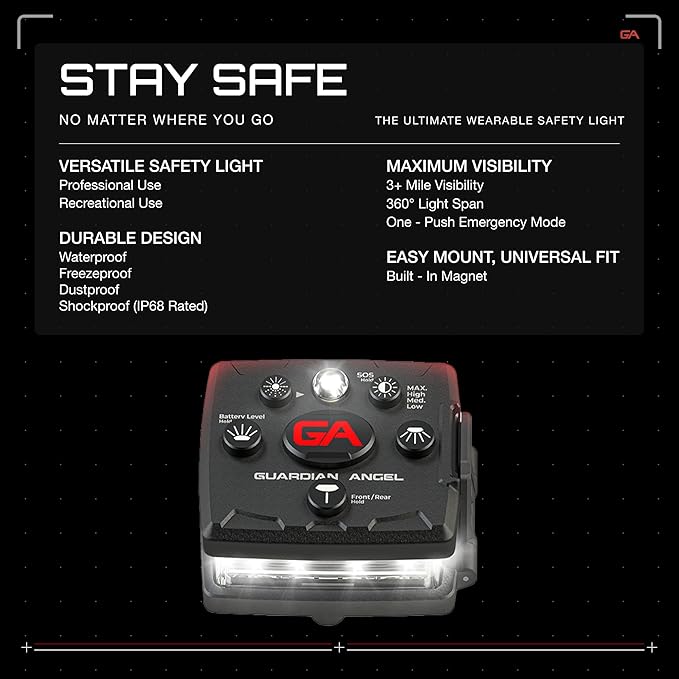 - ๐ ๐ฎ๐ ๐ถ๐บ๐๐บ ๐ฉ๐ถ๐๐ถ๐ฏ๐ถ๐น๐ถ๐๐: With 13 high-output LEDs, the Guardian Angel Micro Series keeps you visible from up to 3+ miles. With 360ยฐ lighting, others can see you from all sides. Four brightness settings, multiple flash patterns, steady burn option and Emergency Mode, ensure others can see you when needed. With 6 white LEDs on the front, 6 red LEDs on the rear, this device features a hands-free white flood light, a white work light, and a white top light.