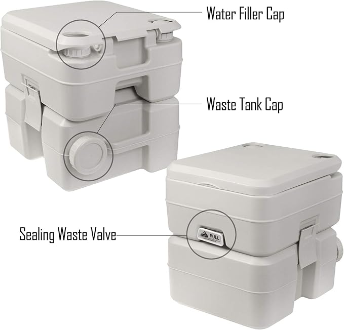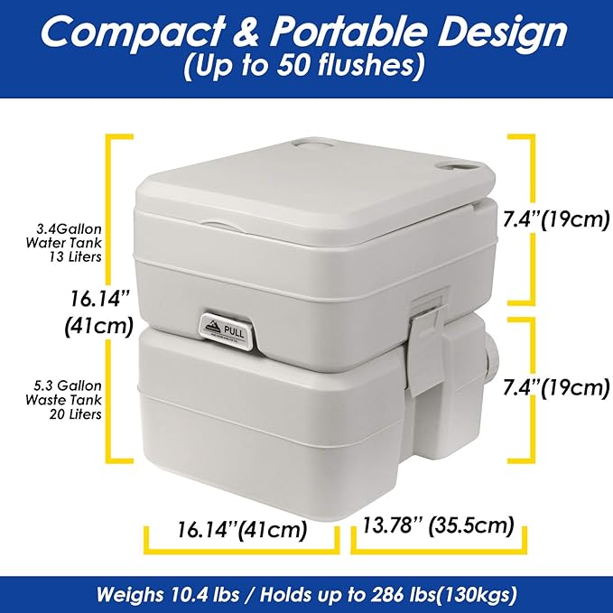 - EXTRA LARGE TOILET TANK: 5.3 gallon toilet tank which is larger than most camping toilets. Fresh water capacity provides up to 50 flushes which means you can use it longer before any need to empty.