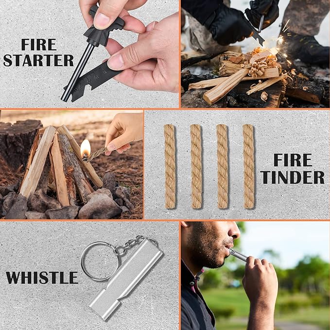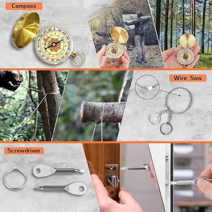 - Included Components : Water Bottle Clip, Wire Saw, Emergency Blanket, Spoon, Fire, Carabiner, Flashlight, Tactical Pen, Waterproof Box, Compass, Fishing Kit Water Bottle Clip, Wire Saw, Emergency Blanket, Spoon, Fire, Carabiner, Flashlight, Tactical Pen, Waterproof Box, Compass, Fishing Kit