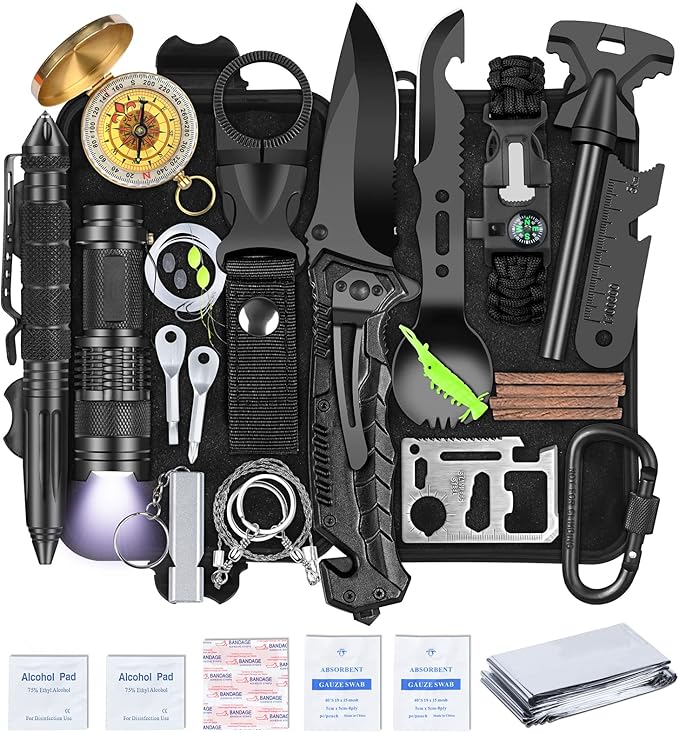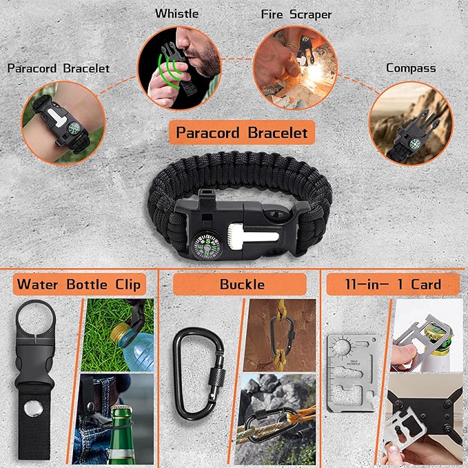 - 【35 in 1 Equipped Survival Kit】LeadNear camping survival kit provides unlimited possibilities for any outdoor sports enthusiast. There are 35 kits in total, including a compass, fishing kit, wire saw, water bottle clip, emergency blanket, ignition cotton, flintstone, scraper, multi-function spoon, flashlight(include battery), multi-function card, tactical pen, Paracord bracelet, carabiner, fire stick, screwdriver, band-aid, absorbent, black waterproof box