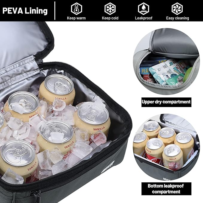 - 2 Compartment Lunch Bag ---- The top "dry" section boasts a yawning U-opening and dual zipper pulls for automatic access, ideal for non-seeping items like fruits, snacks or pies. The bottom "cold" section is no-leak insulated with soft PEVA liner, perfect for drinks, water, juice and suchlike. Easy to clean