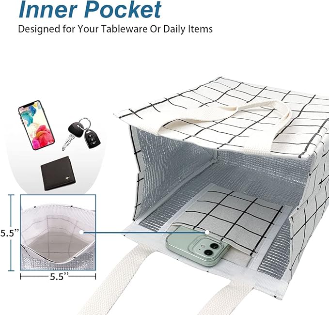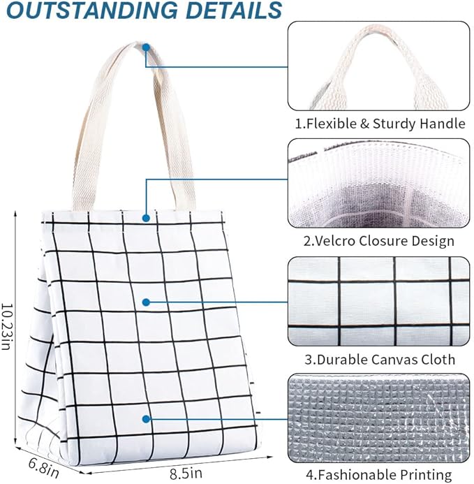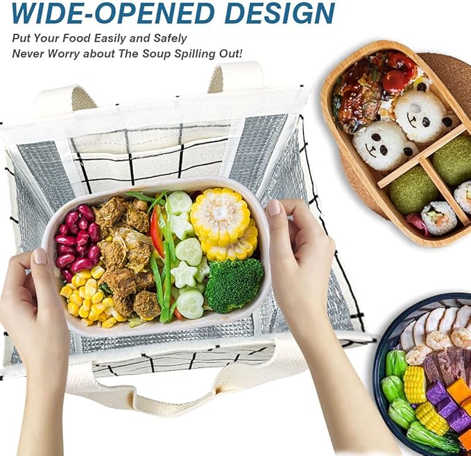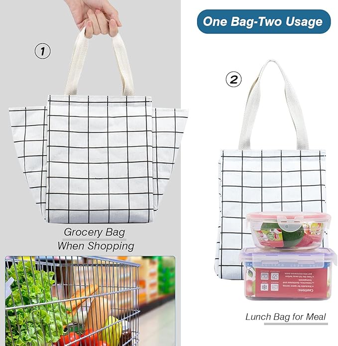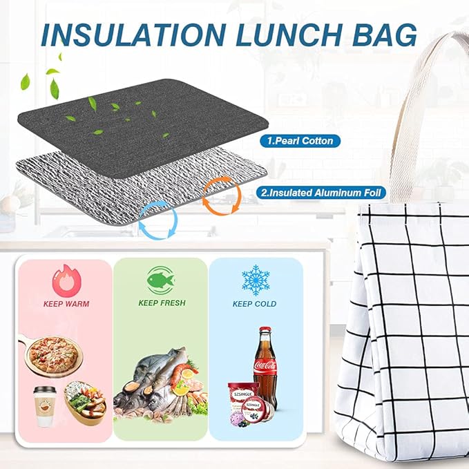 - ❤INSULATED & FOOD-GRADE MATERIAL: The reusable lunch tote bags are constituted with oxford cloth and aluminum foil, which is known for its excellent air isolation and temperature retaining, keeping your food cold/warm for hours. Tight stitching without tearing, sturdy. Can Keeps your food warm or cold for hours well.