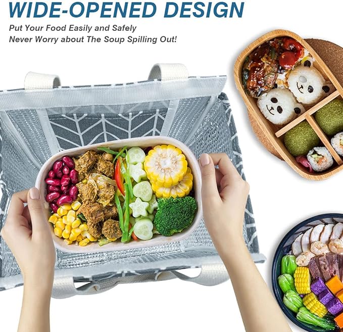 - ❤WIDE-OPEN & VELCRO CLOSURE: the entrance of the thermal lunch box can be opened up to 9.4"L x 6.7"W big. Therefore your containers can be put into the bag and taken out of the bag HORIZONTALLY without risking leaking or spilling. Velcro closure not only makes easy access to your food but also tightly secures your foods in the bag.