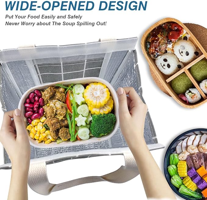 - ❤WIDE-OPEN & VELCRO CLOSURE: the entrance of the thermal lunch box can be opened up to 9.4"L x 6.7"W big. Therefore your containers can be put into the bag and taken out of the bag HORIZONTALLY without risking leaking or spilling. Velcro closure not only makes easy access to your food but also tightly secures your foods in the bag.