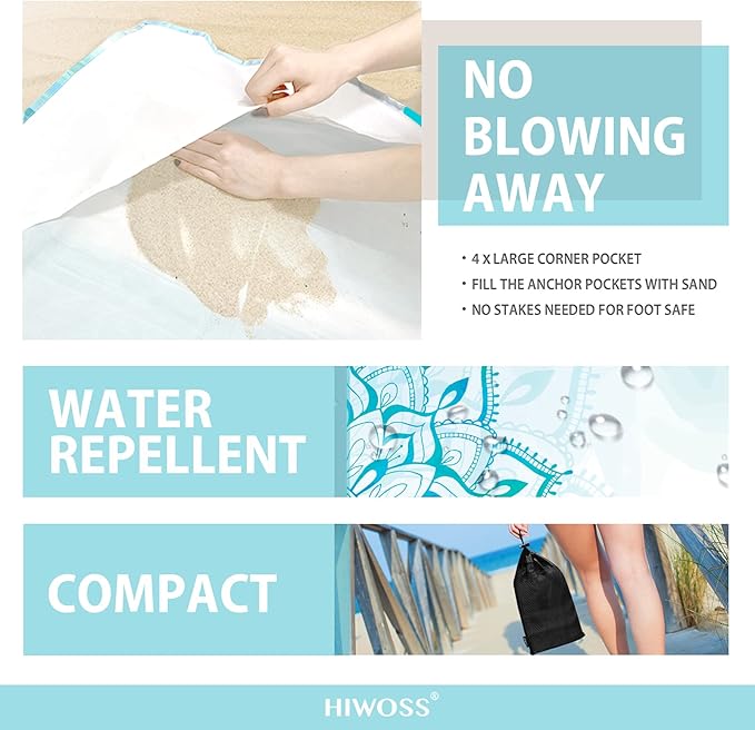 - 【UNIQUE DESIGN, 4 CORNER POCKETS】The eye-catching designed beach blanket, with quality in appearance, will make you stand out on the beach! You can easily find your family and friends on the beach without worrying about getting lost. At the same time, the beach mat is designed with four built-in corner pockets that prevent the blanket from blowing away.