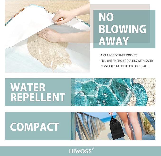 - 【UNIQUE DESIGN, 4 CORNER POCKETS】The eye-catching designed beach blanket, with quality in appearance, will make you stand out on the beach! You can easily find your family and friends on the beach without worrying about getting lost. At the same time, the beach mat is designed with four built-in corner pockets that prevent the blanket from blowing away.