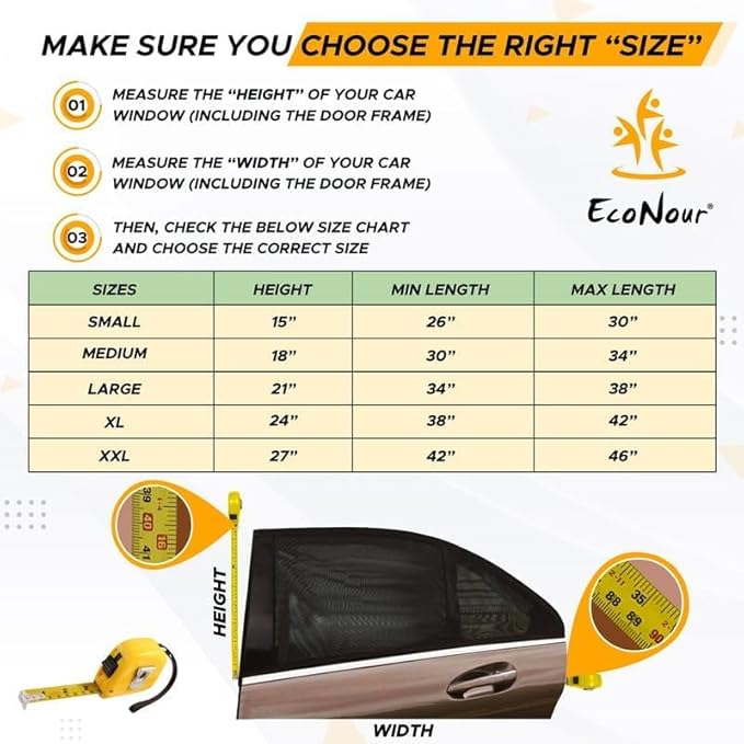 • End-to-End Coverage: EcoNour’s Car Window Covers are made from 95GSM Nylon & Spandex Mesh with heavy-duty rubber, which covers the car’s windows and provides 100% shading protection for you, and your family.