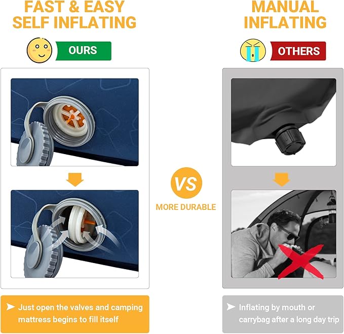 - 【FAST & EASY SELF INFLATING】This sleeping pad made with high-density foam and double 360 rotating valves, makes inflation and deflation quick and easy. Just twist the valves to open and camping mattress begins to fill itself. This camping mat will inflate to 70% full air within 5-10minutes.Note: Please keep the luxury sleeping pad self-inflated for one hour and a few breaths to reach a full thickness in your first use.