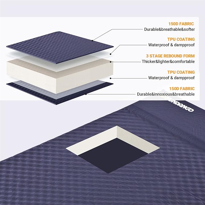 FUNDANGO Double Self Inflating Sleeping Pad for Camping Sleeping Mat with Built-in Pillow, Portable Lightweight Large Inflatable Foam Air Mattress 2 Person for Backpacking, Tent, Car,Travel, Outdoor
