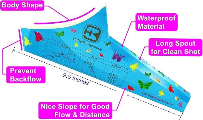 - 🟢 PATENTED DESIGN: As a result of extensive research, the Butterfly Harmony S3 has been designed to be spill-proof, leak-proof, splash-resistant and mess-free. Specially designed with a long spout to increase flow distance from the body with the ability to safely handle flow rate over 100ml/s (5 times higher than the normal female urinary flow rate).