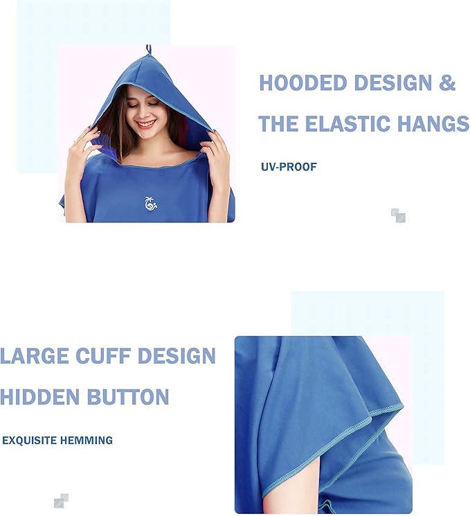 • SOFT AND QUICK-DRYING:The surfing poncho is very soft, excellent water absorption helps dry off the body and hair quickly, and the material itself dries very fast, it is a good helper for travel.