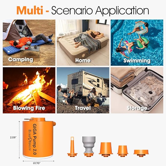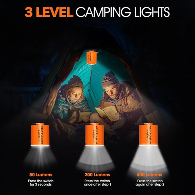 - ✔ 【POWERFUL & EFFICIENT INFLATION】: Equipped with a rechargeable 1300mAh battery, the GIGA PUMP 2.0 is a mini air pump designed to swiftly inflate over 10 standard single air mattresses on a single charge. Ideal for camping, backpacking, and beach outings, this air pump for inflatables also functions as a lantern for up to 10 hours—perfect for low-light conditions. (Note: Actual performance may vary depending on the size of the inflatables)