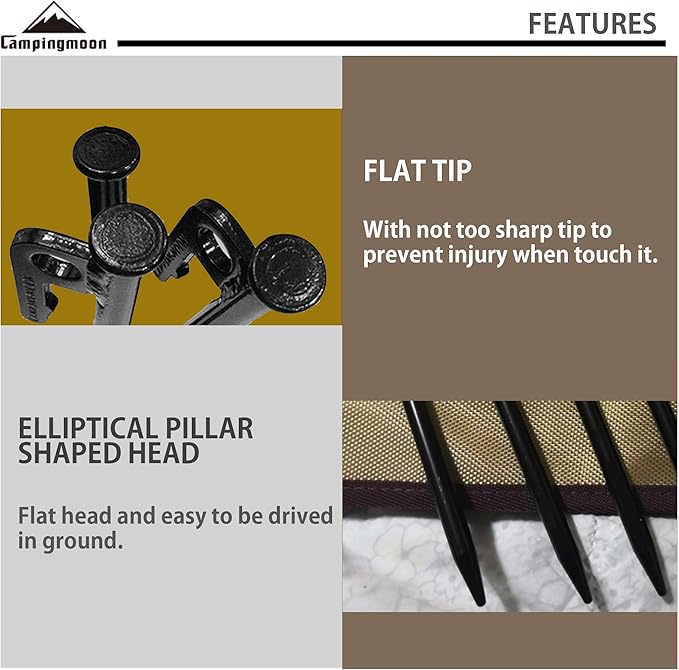 - CAMPINGMOON's heavy duty metal steel camping tent stake is made of high quality forged carbon steel S45C. This heavy duty metal steel camping tent peg is incredibly strong to holding down your tent on hard ground.