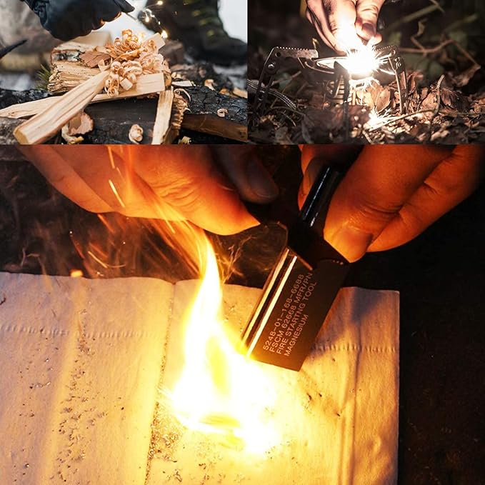 - 🔥 SAFE-The fire starter survival tool will not self-ignition. Burning the magnesium body, Magnesium body will not burn. Only the scraping friction flint rod will produce sparks, may ignition magnesium debris.