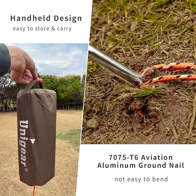 - Outstanding Quality Accessories: Unigear rain fly equipped with 6 high strength 7075-T6 aviation aluminum ground nails which is high strength. 6 of 3.5mm thick wind ropes, not easy to break and good rust prevention pure copper metal ring. It is not easy to fall off through riveting pressing process, and the high quality accessories can extend the service life of the hammock tarp