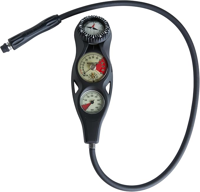 - Sleek, three-gauge inline console combines a pressure gauge, depth gauge, and FS-1.5 compass for easy at-a-glance diving data in a durable, compact plastic-case.
