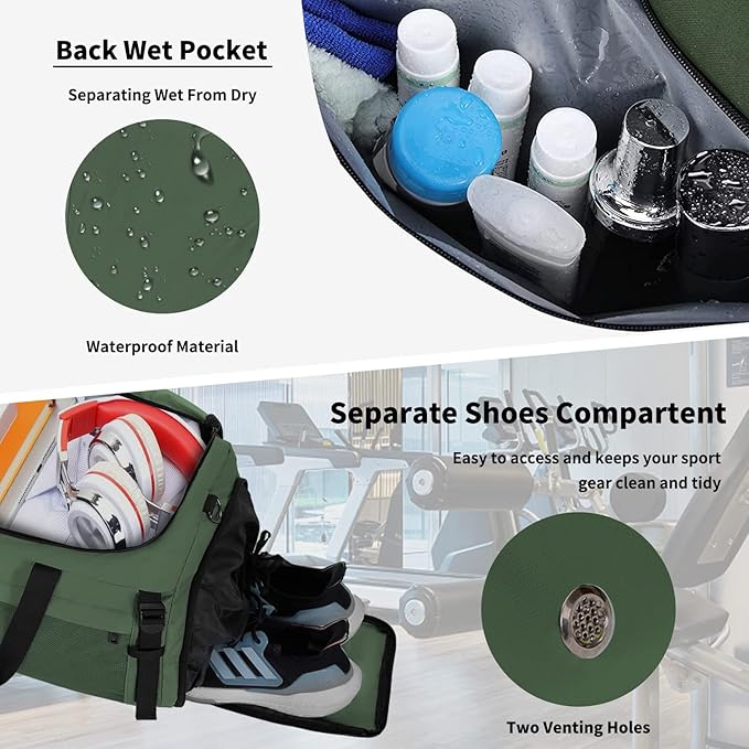 - Dry & Wet Compartment Separation: This gym tote delivers spacious storage with 1 large main zippered compartment for dry & clean clothes or everything for gym & traveling you necessary, and 1 upgraded waterproof PVC lined pocket (20" x 13") with zipper for wet items alongside the main compartment, in addition.