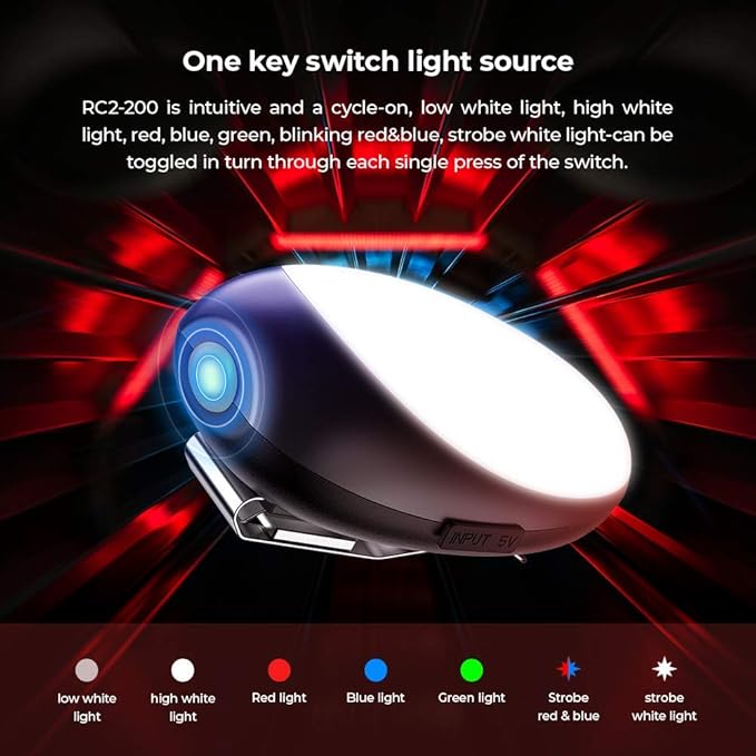 - 【Meet Different Demands】RC2-200 consists of multicolored high quality led-white, red, blue and green. It's suitable for daily uses such as lighting, video light and running. Besides, strobe mode and blinking red-blue mode can be used under circumstances of emergency contact, field search, SOS and backup lighting