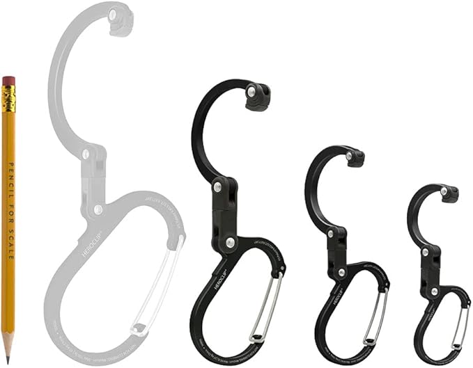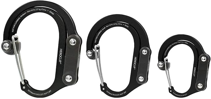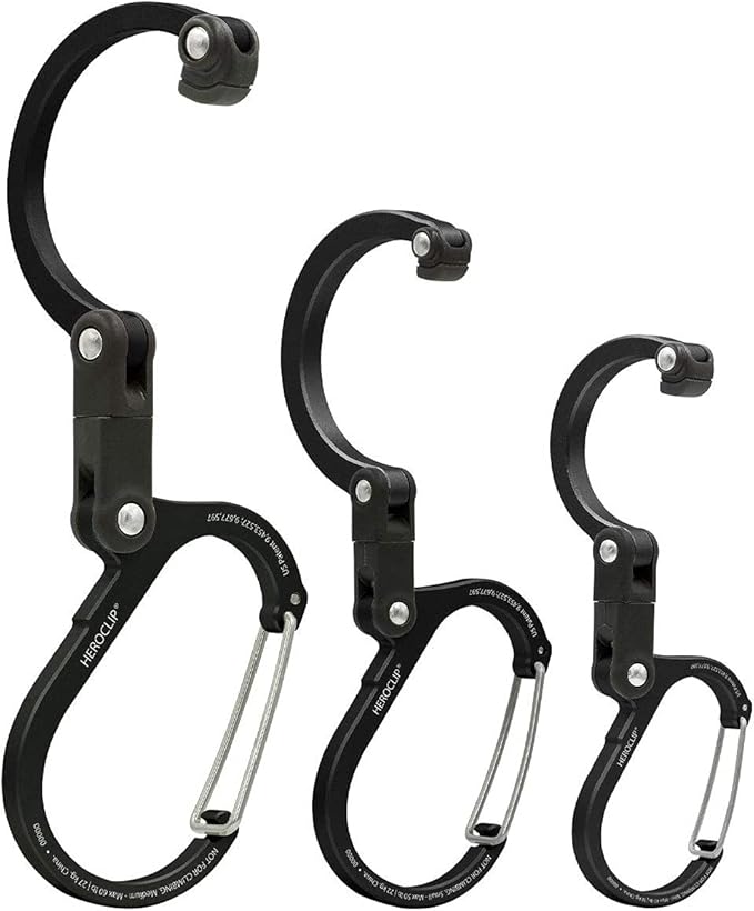 - COMPACT DESIGN: Hook and clip nest together when not in use. SIZE MINI gate clearance 1.1", hook clearance 1.5", dimensions when open 1.8" x 4.6". SIZE SMALL gate clearance 1.2", hook clearance 1.5", dimensions when open 2.2" x 5.6". SIZE MEDIUM gate clearance 1.5", hook clearance 1.8", dimensions when open 3" x 3.75".