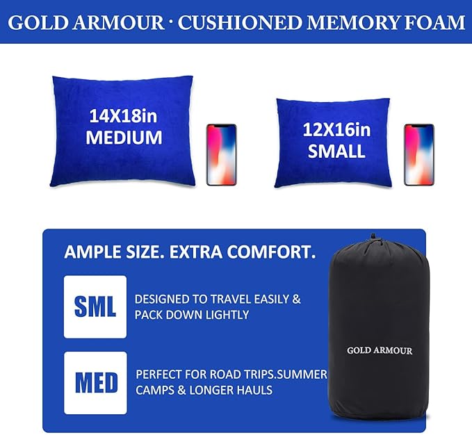 Gold Armour Camping Pillow - Backpacking and Travel Pillow for Sleeping and Traveling - Compressible Memory Foam Travel Pillow - Essential Camping Accessories Gear (Medium 14x18in, Blue)